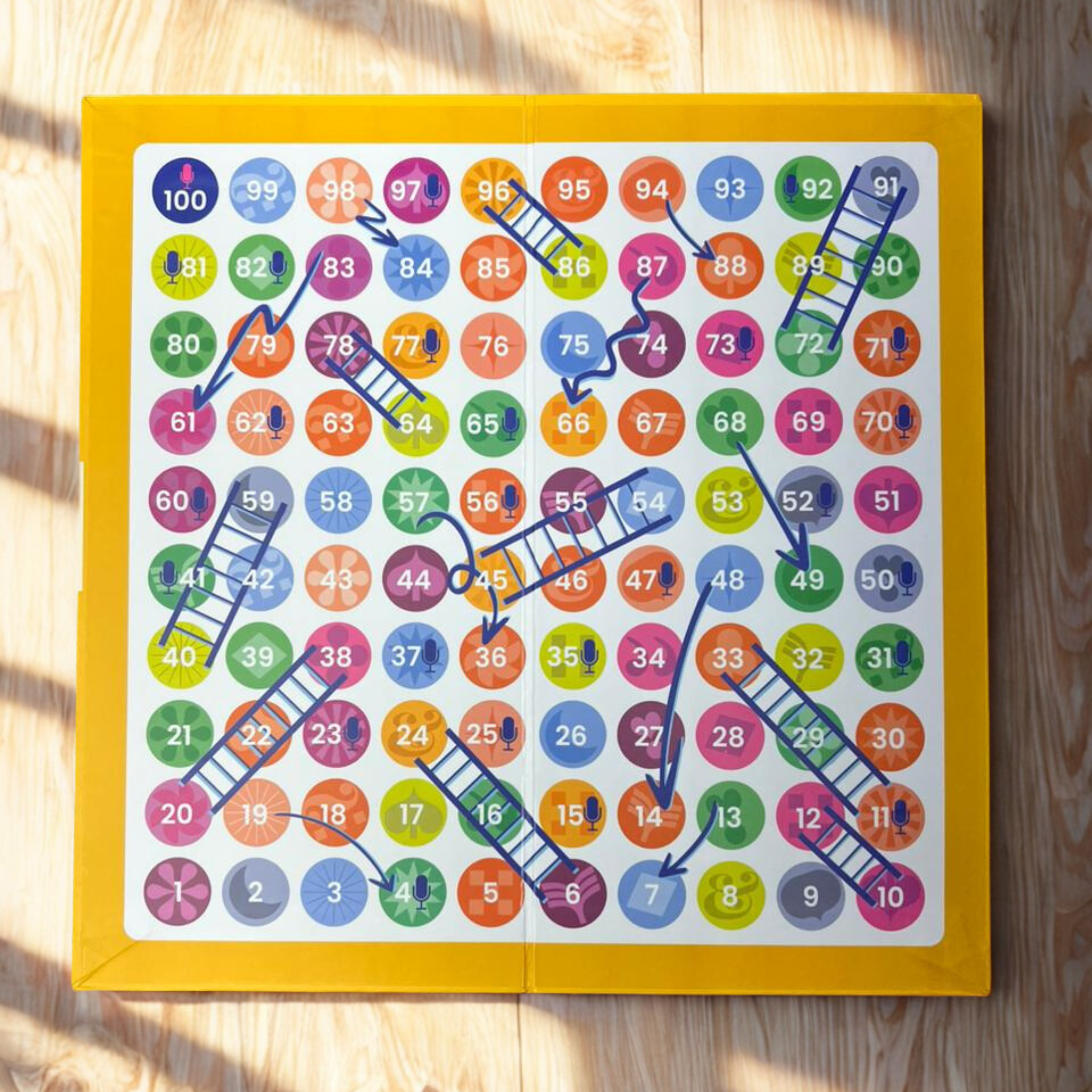 To start, each player throws the dice. If you get the number 1 or 6, you can place your token on the first square. Now you can throw the dice again and move your token according to the number shown on the dice. Players move across the board in this manner and whoever reaches the number 100 first is the winner.